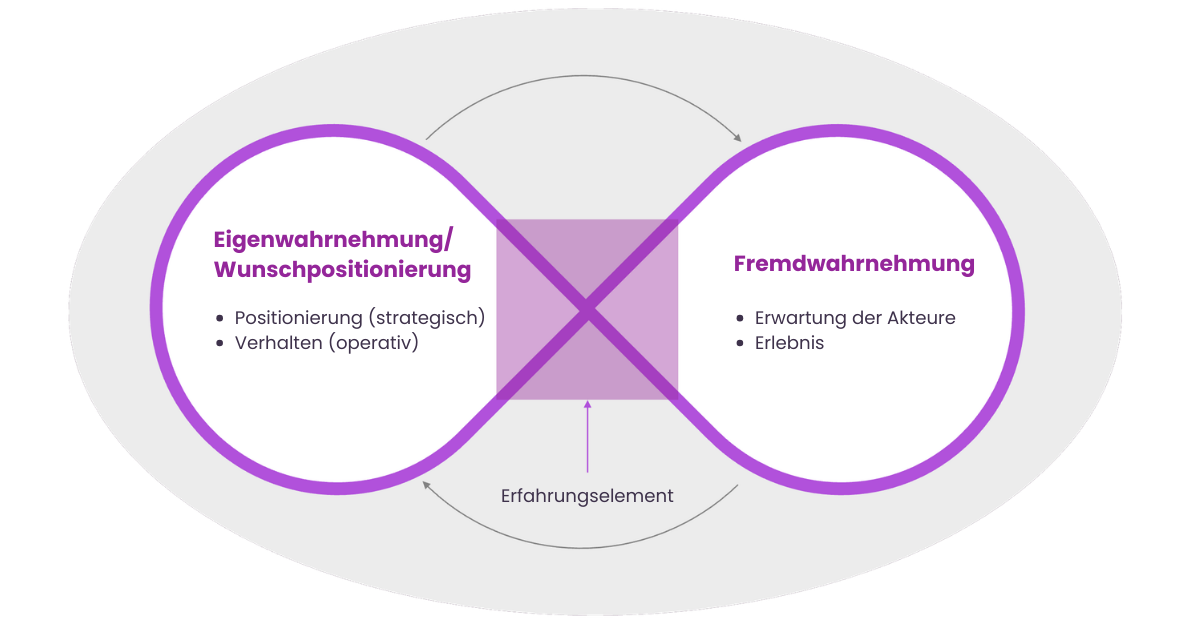 In der Reputation Journey beeinflussen sich Eigenwahrnehmung oder auch Wunschpositionierung sowie Fremdwahrnehmung fortlaufend gegenseitig. Wenn diese beiden Perspektiven aufeinander treffen, entsteht das so genannte Erfahrungselement. Auf Grundlage der Fremdwahrnehmung können in der Folge die Positionierung und das Verhalten angepasst werden. So ergibt sich ein fortlaufender Prozess aus Aktion, Reaktion und Interaktion.